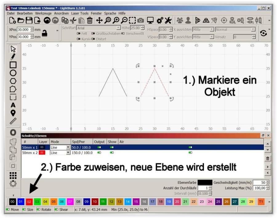 Hast du mehrere Objekte auf deiner Lightburn-Oberfläche? Wähle ein Objekt aus und klicke auf eine der Farben in der unteren Leiste. Das war’s auch schon! Lightburn wird dem ausgewählten Objekt nun eine neue Ebene zuweisen.