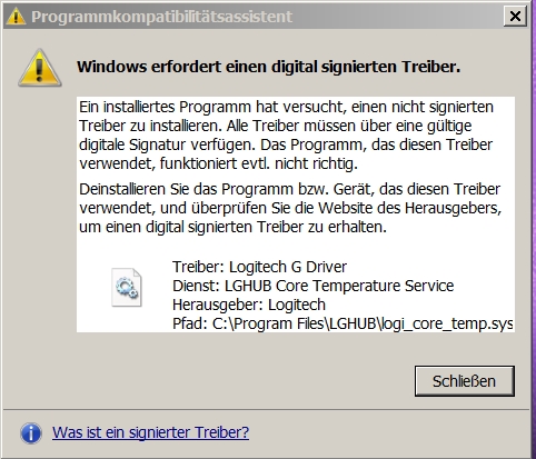 Ein installiertes Programm hat versucht, einen nicht signierten Treiber zu installieren. Alle Treiber müssen über eine gültige digitale Signatur verfügen. Das Programm, das diese Treiber verwendet, funktioniert evtl. nicht richtig.