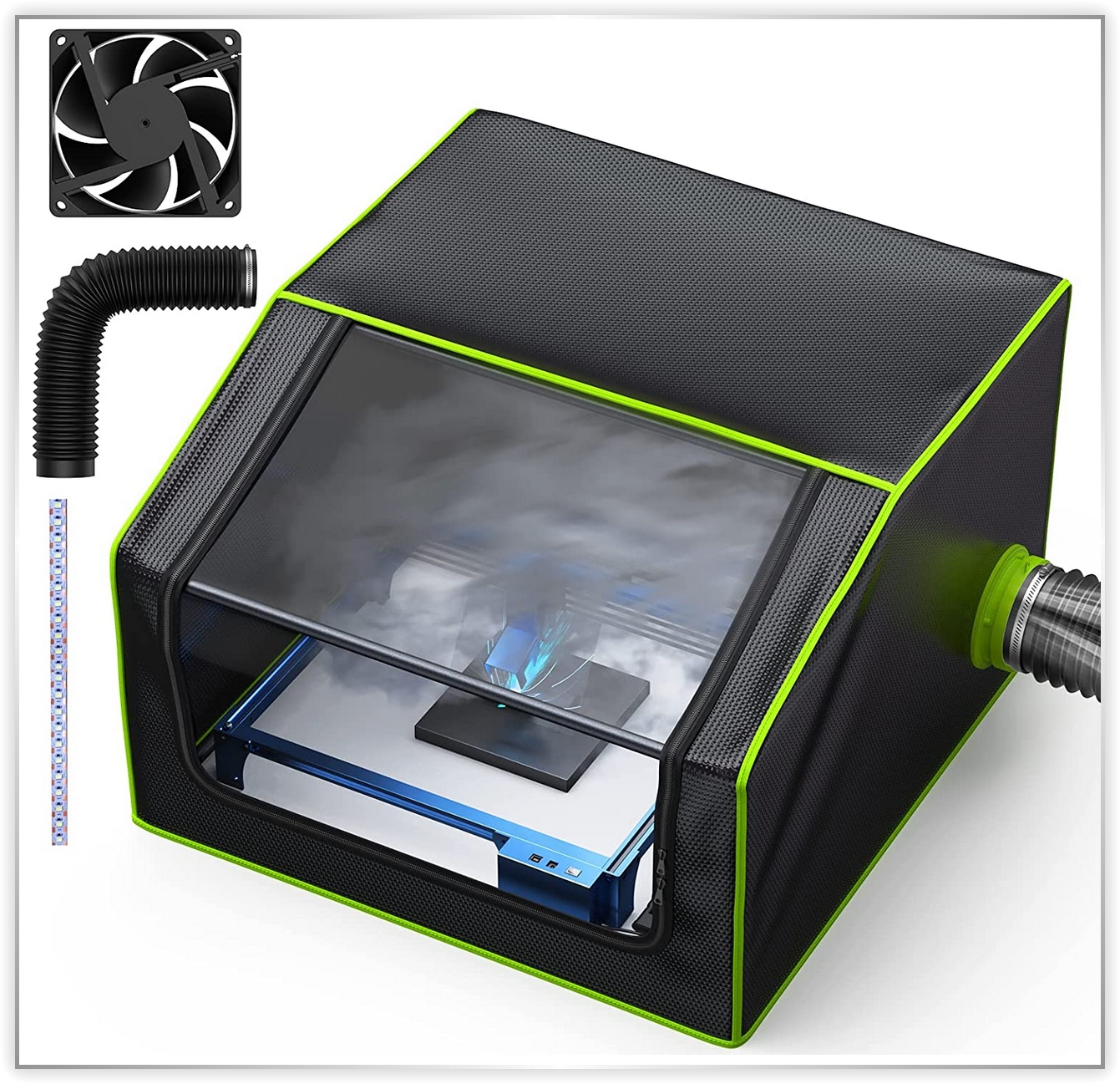 Wenn du nicht beabsichtigst, Reduzierstücke zu verwenden (da ein schmalerer Schlauch besser durch den Fensterspalt im Arbeitszimmer passt), und den 150 mm Schlauch direkt am Lasergehäuse montierst, entsteht durch den Lüfter ein derart starker Sog (Unterdruck), dass sich die seitlichen Wände meiner Laserumhausung sichtbar verformen. Selbst wenn ich mit 6 Bar Druckluft durch die Air-Assist-Düse arbeite, gelingt es diesem Ventilator, das Lasergehäuse nahezu leer zu saugen.