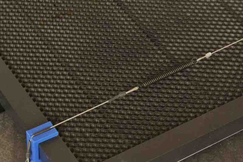 Ein 1 mm Drahtseil stellt eine ausgezeichnete Wahl dar, während 2 mm Drahtseil aufgrund seiner Starrheit weniger geeignet ist. In der folgenden Darstellung erfährst du, wie die Feder mithilfe von Schlaufen, Aluminiumhülsen und Schrumpfschlauch am Drahtseil befestigt wird.