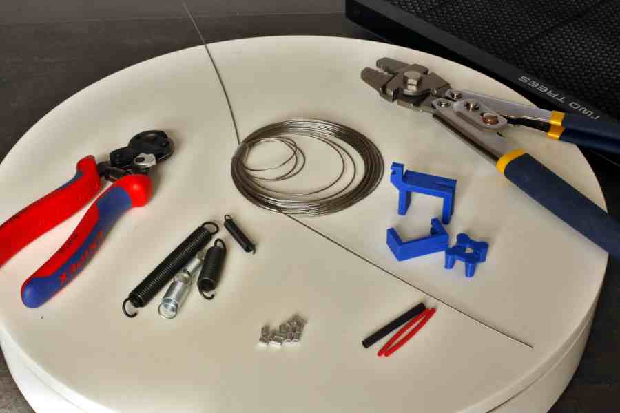 Ein Durchmesser von 1 mm ist für mich in Ordnung. Es sollte jedoch nicht dicker sein. Das Drahtseil muss sich geschmeidig biegen lassen und problemlos über die Spannklemmen führen. Ein 2 mm starkes Drahtseil war bereits zu steif für meine Anforderungen.