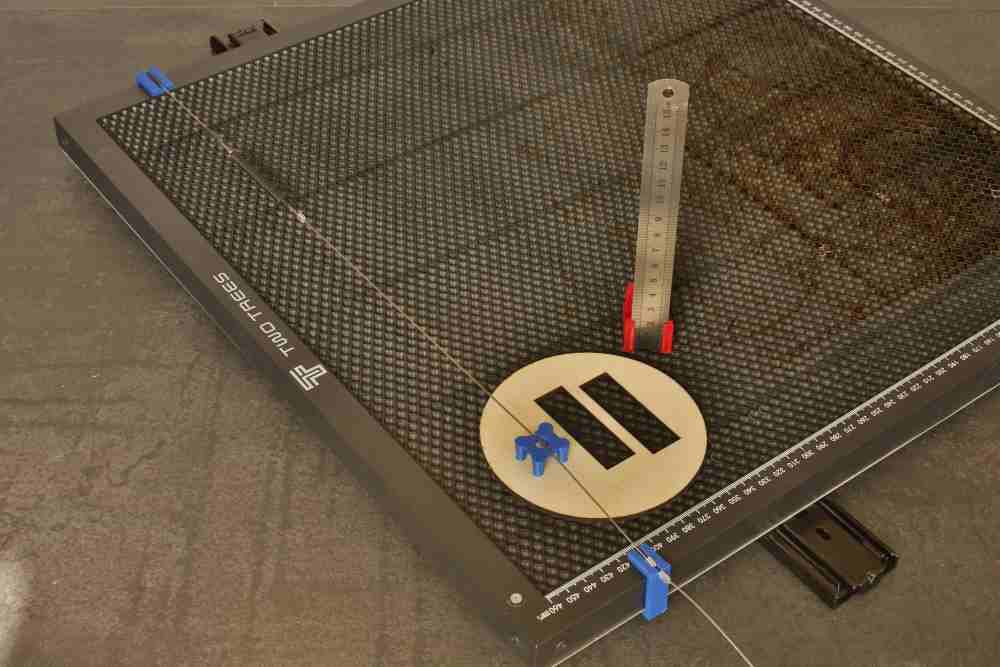 Wenn Du eine wellige 4 mm Sperrholzplatte lasern möchtest, benötigst Du mehrere Spann-Gurte für Deinen Wabentisch. Bisher habe ich verzogene Platten mit schweren Eisenteilen beschwert, jedoch sind diese oft zu dick und behindern die Düsen des Air-Assist. Diese Befestigungstechnik ist nicht nur für Aluminium-Wabentische, auch als „Honeycomb-Arbeitstische“ bekannt, geeignet. In abgewandelter Form lässt sich diese Methode auch auf höhenverstellbaren Tischsystemen für CO2-Laser (z.B. K40 aus China) anwenden. Dank unterschiedlich dimensionierter „Höcker“ kannst Du variieren, wie viel Druckkraft auf das Werkstück ausgeübt wird. Je nach Stärke der verwendeten Zugfeder wird das Werkstück unterschiedlich fest auf dem Arbeitstisch beziehungsweise Wabentisch fixiert. Bis zu 8 Bar (bei meiner Auswahl der Feder) hielt die Drahtseil-Spezialvorrichtung sowohl kleinere als auch größere Werkstücke sicher an ihrem Platz. Im Nachhinein stellte ich jedoch fest, dass die Verspannung des Bauteils auf dem Wabentisch innerhalb der Laserumhausung sehr kraftaufwendig war. Eine mögliche Lösung besteht darin, ein weniger straff gespanntes Drahtseil zu verwenden, bei dem die Spannung mit der „Höhe der Hocker“ leicht angepasst werden kann.